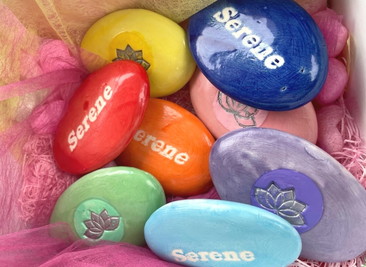 チャクラカラーに合わせた配色で、心身共に癒すストー ン。 その時の気分や心身の状態に合わせてお好みの色で置石からセラピーを始めることができます。ヨガの講師は背中にチャクラストーンを載せて生徒様の柔軟性を上げているそうです。脚のセラピーには脚後面に並べて使用。