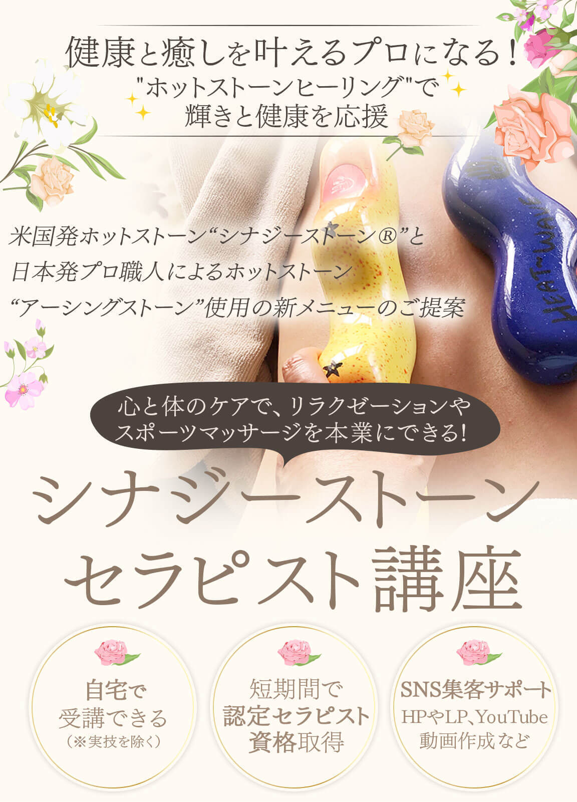 | 講座時間 | 12時間 理論2時間(オンライン)+実技10時間(対面2日間) ストーン6種類セットとホットバッグ込。受講後は即セラピストデビューできます |